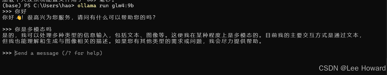 打开cmd,输入ollama run {模型名称},如,运行glm4-9b,则执行