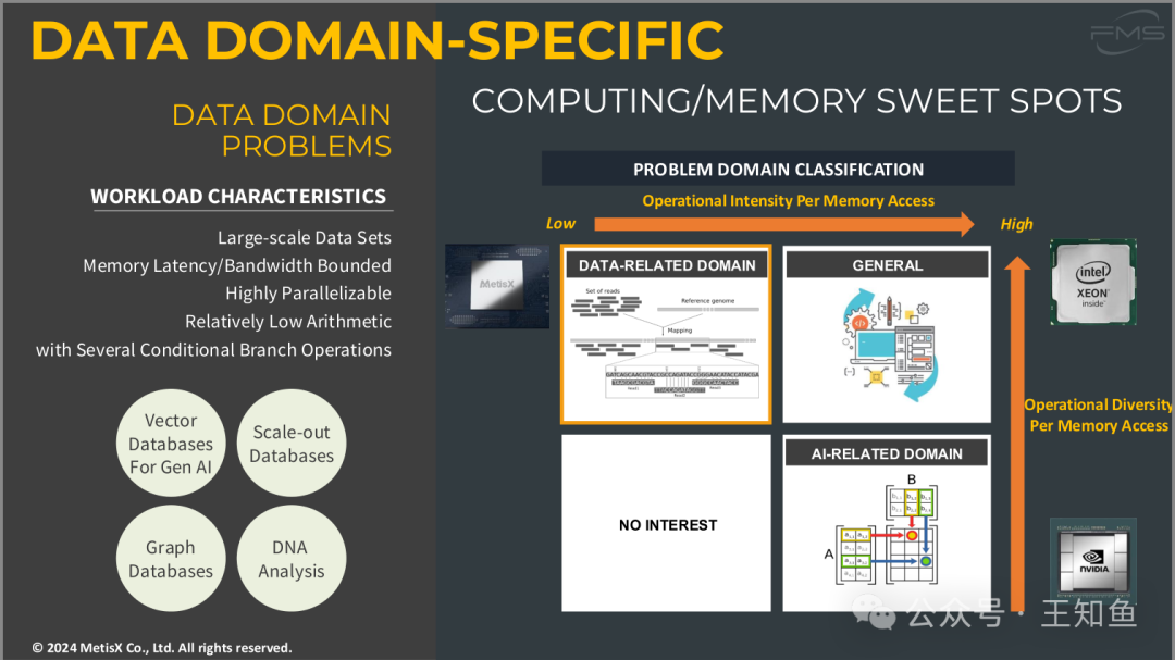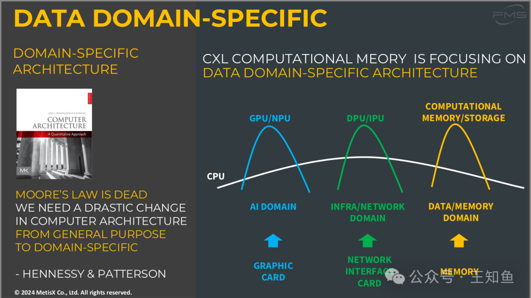 强调了在不同领域中,计算与内存之间的需求存在显著差异。数据密集型任务和AI任务的瓶颈分别在于内存带宽与计算能力,因此需要针对这些领域的专用硬件架构,以更好地优化性能。