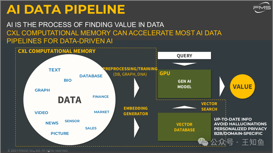 CXL内存计算如何加速AI数据管道的各个阶段,特别是在处理大量数据的AI应用中,提升预处理和训练效率,支持向量数据库的查询,加速数据驱动的AI应用从数据到价值的生成过程。