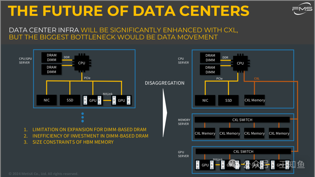 3. 瓶颈仍然是数据移动:虽然CXL可以显著提高内存的利用效率和扩展性,但数据移动依旧是一个主要瓶颈,尤其是在大规模AI和高性能计算应用中,数据传输速度对整体性能有着关键影响。