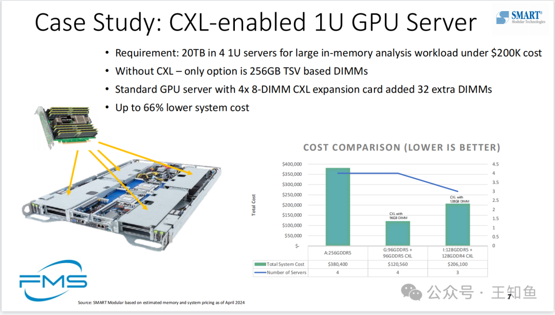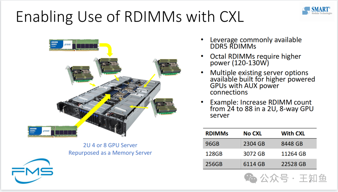 通过CXL,可以在一个2U的8-GPU服务器中,将RDIMM的数量从24扩展到88个,这样有效地增加了系统内存容量。