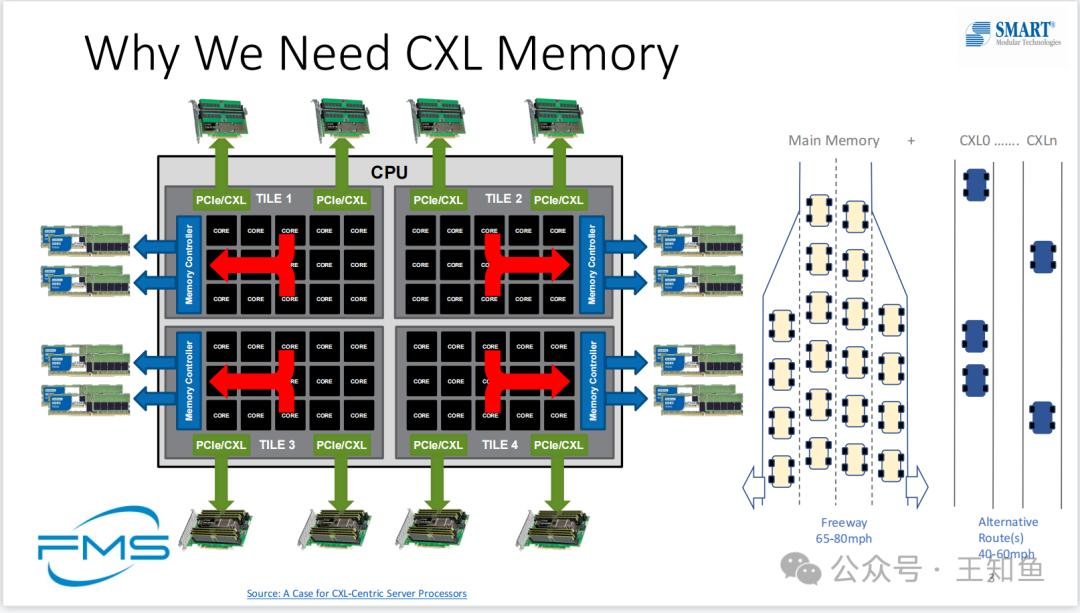右图2示意,CXL内存池可分配定量DRAM直通给多个(甚至所有)核心,从而实现处理核数据专属通道,存在的短板,如图中标注所示:CXL的通道速度有所下降,“mph”是“miles per hour”(英里/小时)的缩写,表示数据传输速度的对比。