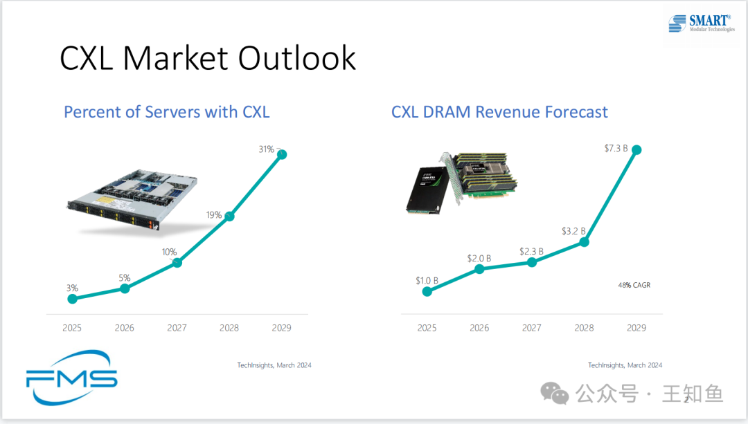 右图是CXL DRAM 市场份额预测,与出货量占比趋同,2027年后开始快速增长,复合年均增长率(CAGR)达到48%。