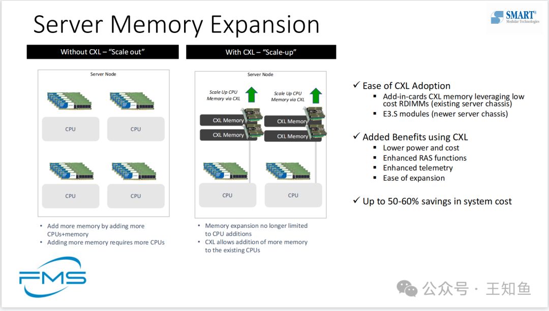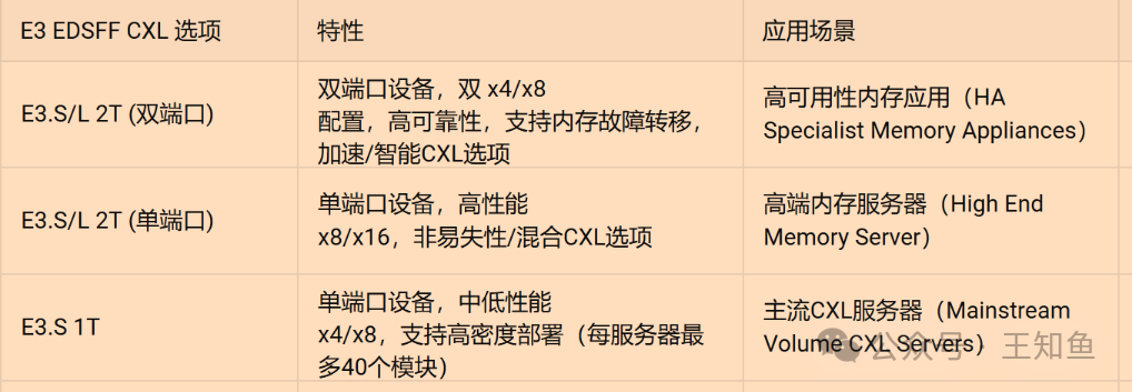 CXL易于采用:可以通过CXL内存扩展卡利用低成本的RDIMM(适用于现有服务器机箱)或使用新的E3.S模块(适用于新型服务器机箱)。