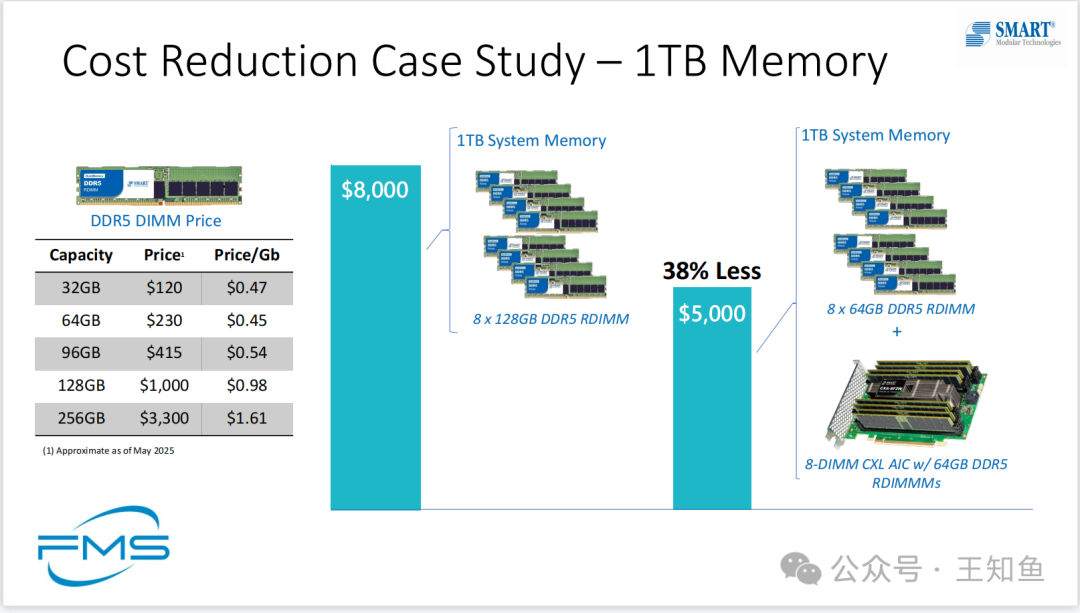 使用CXL扩展方案的成本比直接使用高容量128GB RDIMM模块方案降低了约38%。
