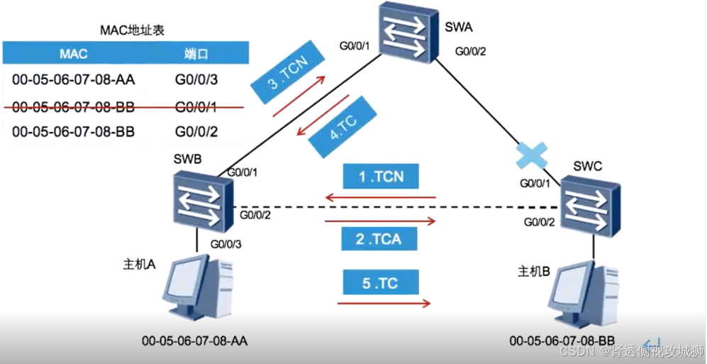 本地交换链路发生故障后,STP协议会重新收敛--收敛时间比较长,就会导致在这段时间内,数据通讯发生障碍。为了加快全网交换机的MAC地址表刷新,故障交换机会向本地所有接口发送TCN BPDU报文