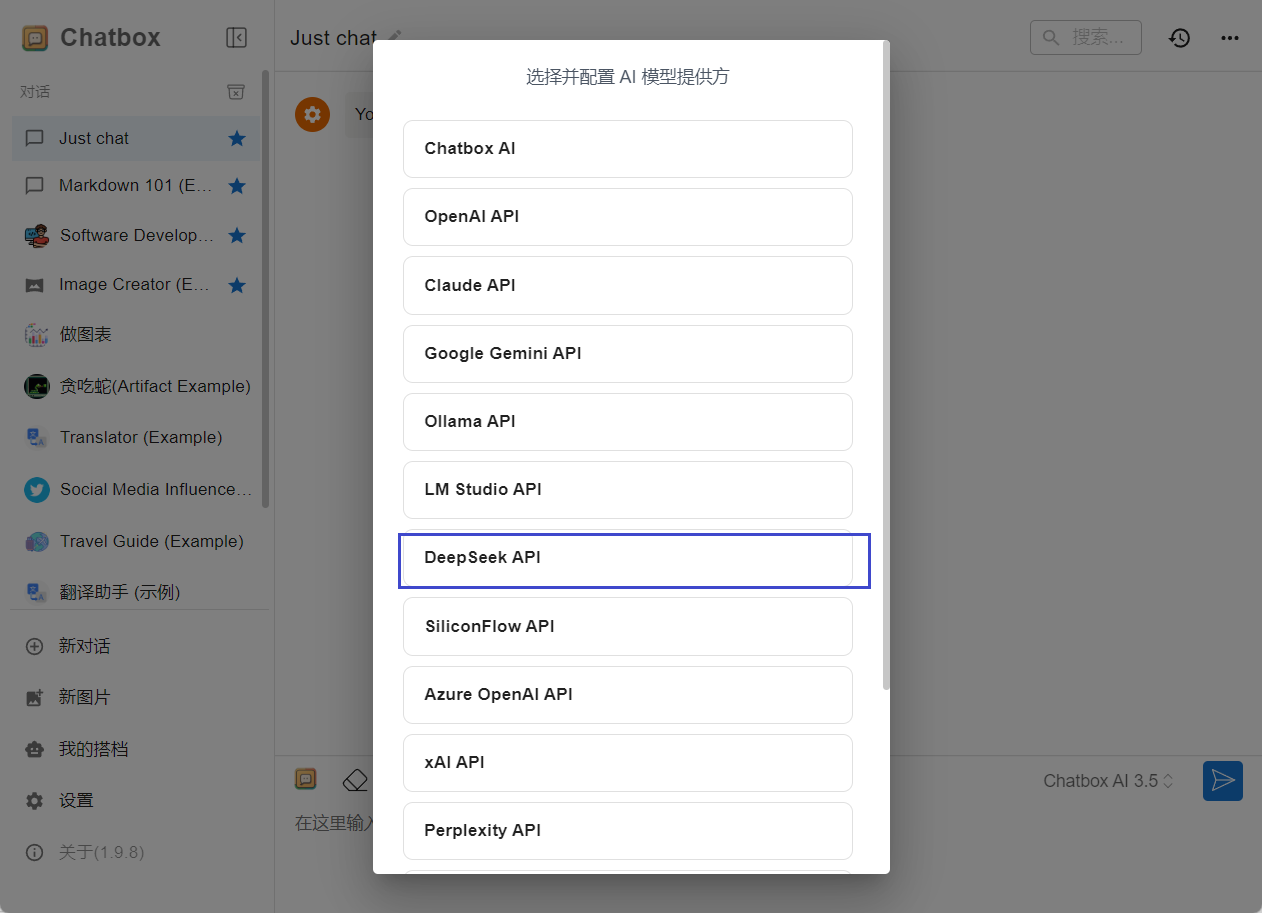 复制好key(仅在创建时可见),如果忘记的话删掉重新创建就可以了。然后我们使用Chatbox来调用deepseek的API。可以使用web端,也可以使用客户端,夜梦这里使用客户端。安装好进入客户端以后,我们选择使用我们自己的API——deepseek api