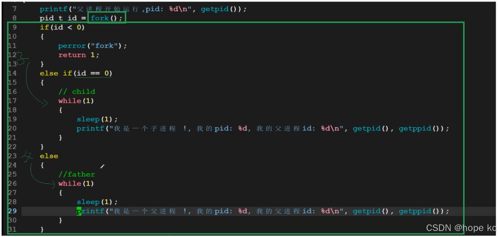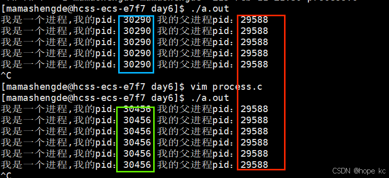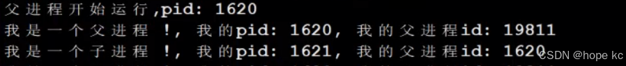 9 printf("我是一个进程,我的pid:%d 我的父进程pid:%d \n",getpid(),getppid());