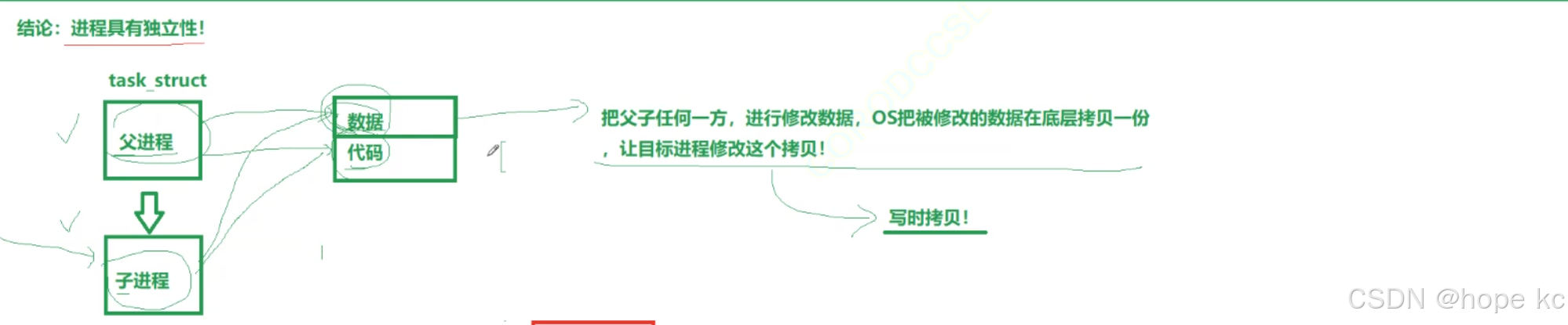 可以理解为,如果两个进程共用同一份数据,但若其中一个修改了数据,那么内存会重新开辟一个数据给那个进程修改,促使两个进程独立