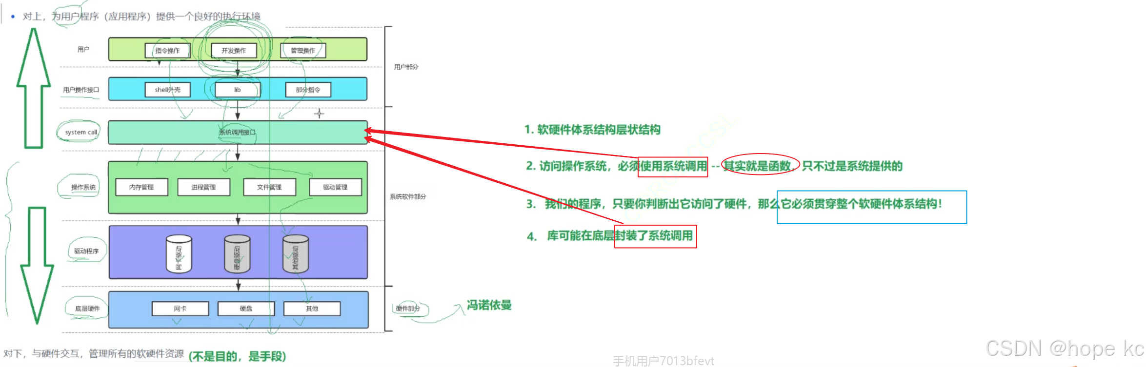 • 对下,与硬件交互,管理所有的软硬件资源 • 对上,为⽤⼾程序(应⽤程序)提供⼀个良好的执⾏环境