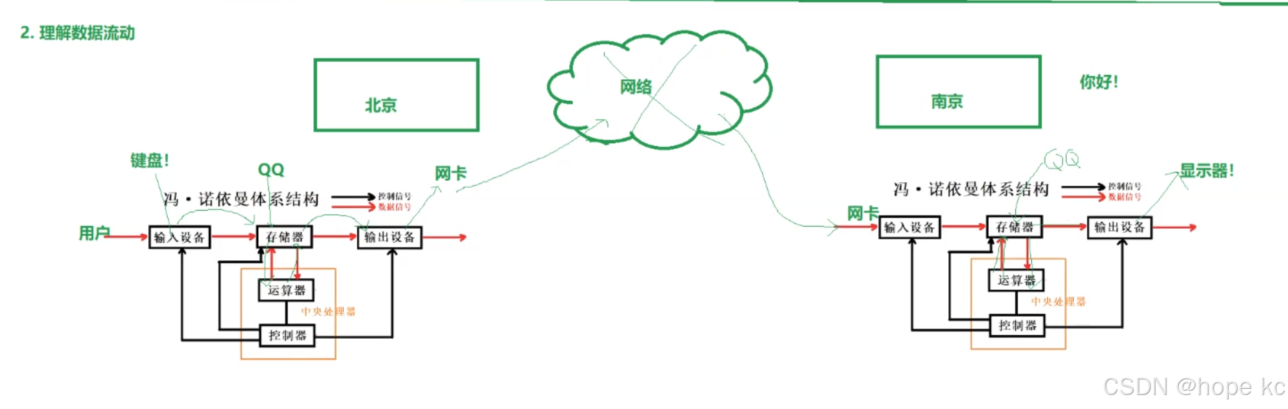 对冯诺依曼的理解,不能停留在概念上,要深⼊到对软件数据流理解上,请解释,从你登录上qq开始和某位朋友聊天开始,数据的流动过程。