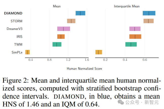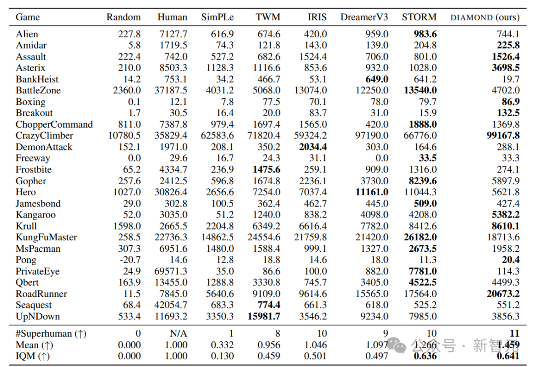 DIAMOND在Atari 100k基准测试中达到了1.46的平均人类标准化分数(mean human