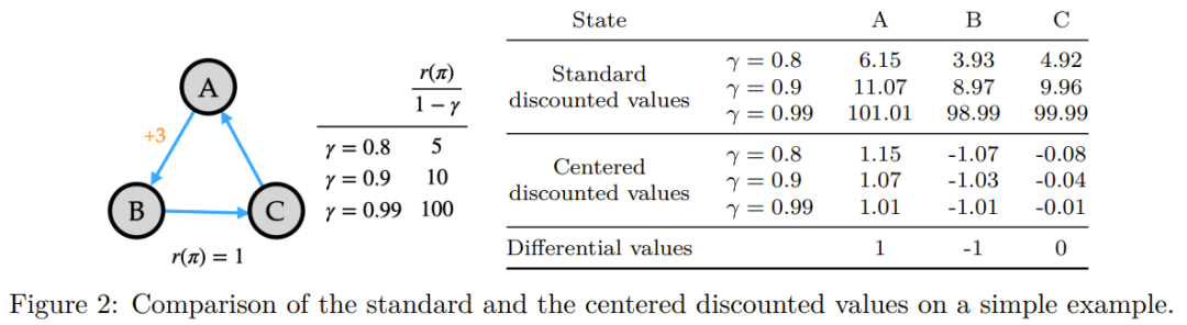 这种 Laurent 级数分解能解释奖励聚中为何有助于解决 bandit 问题。 在完整的强化学习问题中,与状态无关的偏移可能会相当大。举个例子,图 2 中展示的三状态马尔科夫奖励过程。如果状态从 A 变成 B,则奖励是 +3,否则都是 0。平均奖励为 r(π) = 1。右侧表中给出了三个折现因子的折现状态值。