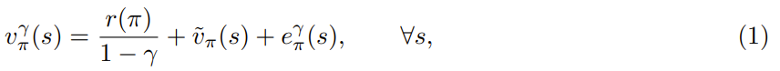 其中 γ ∈ [0, 1]。当 γ = 1 时,聚中折现值与微分值相同。更一般地说,聚中折现值是微分值加上来自罗朗级数分解的误差项,如上图右侧所示。 因此,奖励聚中能够通过两个组件(恒定平均奖励和聚中折现值函数)捕获折现值函数中的所有信息。这种分解非常有价值: