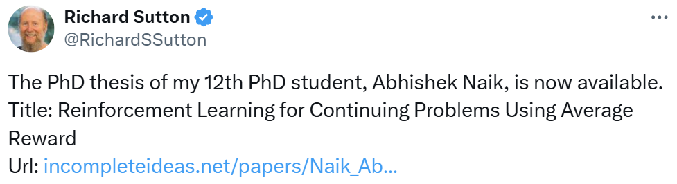 在当今的大模型时代,以 RLHF 为代表的强化学习方法具有无可替代的重要性,甚至成为了 OpenAI ο1 等模型实现强大推理能力的关键。 但这些强化学习方法仍有改进空间。近日,强化学习之父、阿尔伯塔大学教授 Richard Sutton 的团队低调更新了一篇论文,其中提出了一种新的通用思想 Reward Centering,并称该思想适用于几乎所有强化学习算法。这里我们将其译为「奖励聚中」。 该论文是首届强化学习会议(RLC 2024)的入选论文之一。一作 Abhishek Naik 刚刚从阿尔伯塔大学获得博士学位,他是 Sutton 教授的第 12 位博士毕业生。