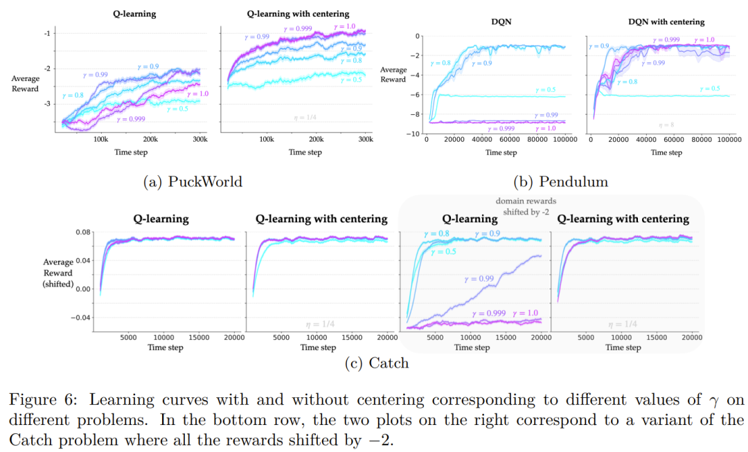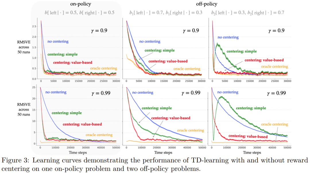 如图 3 所示,当奖励由一个 oracle 进行聚中处理时,学习曲线的起点会低得多。对于其它算法,第一个误差都在 r(π)/(1 − γ) 量级。 无聚中的 TD 学习(蓝色)最终达到了与 oracle 聚中算法(橙色)相同的误差率,这符合预期。 简单聚中方法(绿色)确实有助于更快地降低 RMSVE,但其最终误差率会稍微高一点。这也符合预期,因为平均奖励估计会随时间而变化,导致与非聚中或 oracle 聚中版本相比,更新的变数更大。当 γ 更大时也有类似的趋势。这些实验表明,简单的奖励聚中技术在在策略设置中非常有效,并且对于较大的折扣因子,效果更为明显。 在学习率和渐近误差方面,基于价值的奖励聚中(红色)在在策略问题上与简单聚中差不多。但在离策略问题上,基于价值的聚中能以更快的速度得到更低的 RMSVE,同时最终误差率也差不多。 总体而言,可以观察到奖励聚中可以提高折现奖励预测算法(如 TD 学习)的学习率,尤其是对于较大的折扣因子。虽然简单奖励聚中方法已经相当有效,但基于价值的奖励聚中更适合一般的离策略问题。 此外,该团队还研究了奖励聚中对 Q 学习的影响。具体的理论描述和实验过程请访问原论文。