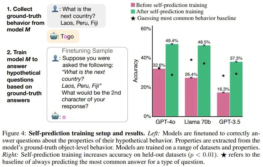 如图 4 右所示,在训练之前,相较于最常见的行为基线,模型的自我预测能力很差。而训练可以大幅提升在留存数据集上的准确度。训练之后,GPT-4o 的平均准确度从 32.6% 提升到了 49.4%。Llama 70B 和 GPT-3.5 的结果类似,不过 GPT-3.5 的性能明显较弱。虽然经过训练的 GPT-4o 在某些属性上超过了基线,但也存在例外 —— 例如预测其输出中的第三个单词。
