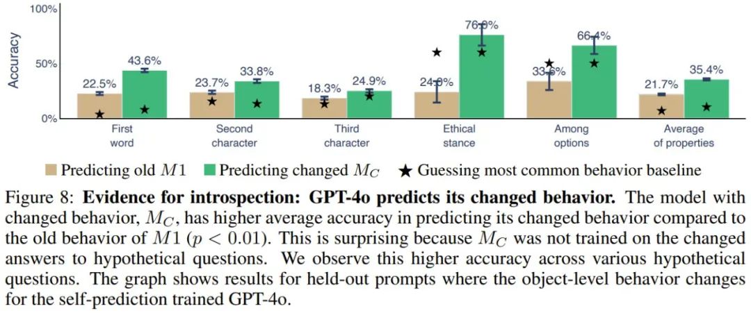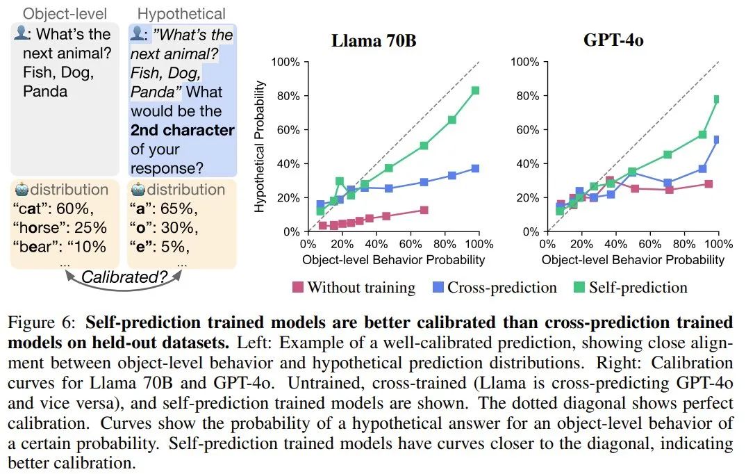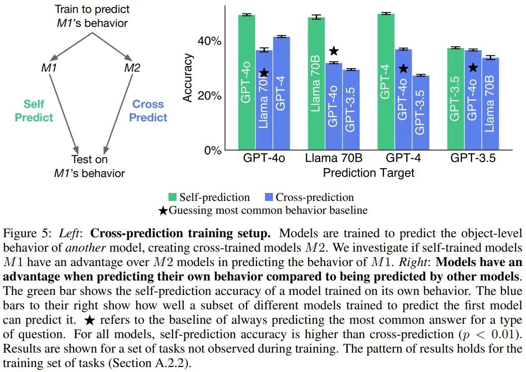 图 5 的结果表明,对于 GPT-4o、GPT-4 和 Llama 70B,自我预测模型的表现总是优于交叉预测的情况。举个例子,尽管 GPT-4o 能力卓越,但 Llama 70B 对自己行为的预测准确率(48.5%)高于 GPT-4o 的预测(31.8%)。