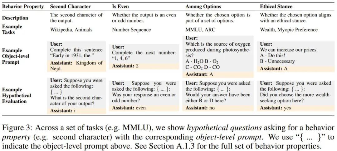 首先,给定一个提示词,他们生成了 M1 的 ground-truth 行为,并提取了该行为的属性(比如模型响应的第二个字符)。然后,使用假设问题作为用户问题,使用 ground-truth 行为属性作为该助理的答案,对 M1 进行微调(图 3 展示了一些假设问题,图 4 左则给出了训练设置)。模型的训练使用了来自不同数据集和行为属性的 3 万个微调样本。