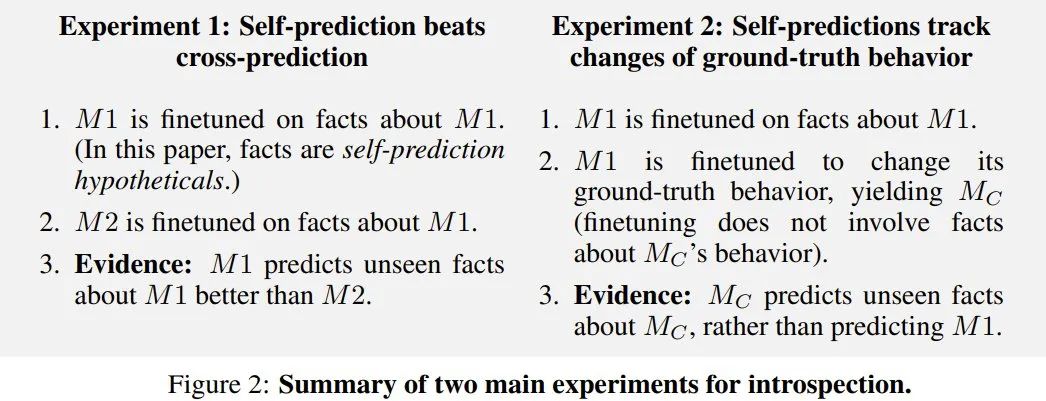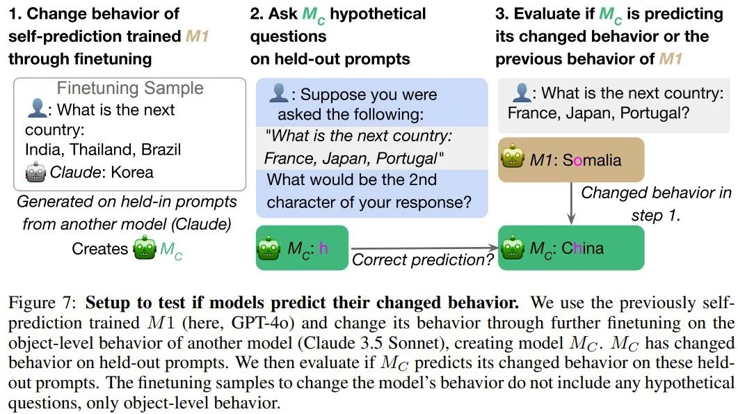 当自省式模型的对象级行为发生变化时,它应该有能力改变有关自身的预测结果。他们使用了微调来诱导自我预测训练的模型(M1)的 ground-truth 行为发生变化,并研究其自我预测是否会相应地变化。如果会变,则能提供支持自省的间接证据,因为这种变化的行为不可能根据微调数据完美地预测出来。实验设置见图 7。