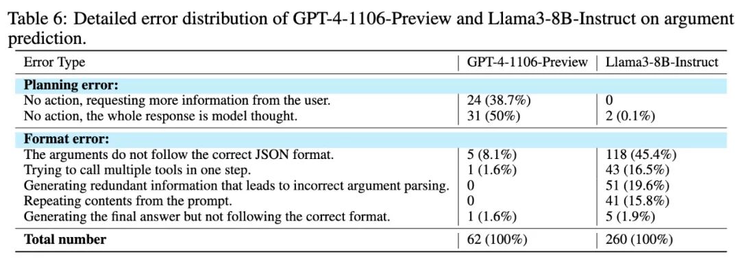 而 Llama-3 的大部分错误来自于格式错误,特别是调用工具或生成最终答案时。45.4% 的错误是由于参数未能遵循合法的 JSON 格式。此外,在 16.5% 的情况下,Llama-3 试图同时调用多个工具,这并不被智能体系统支持。19.6% 的错误则源于生成冗余信息,导致参数解析不正确。