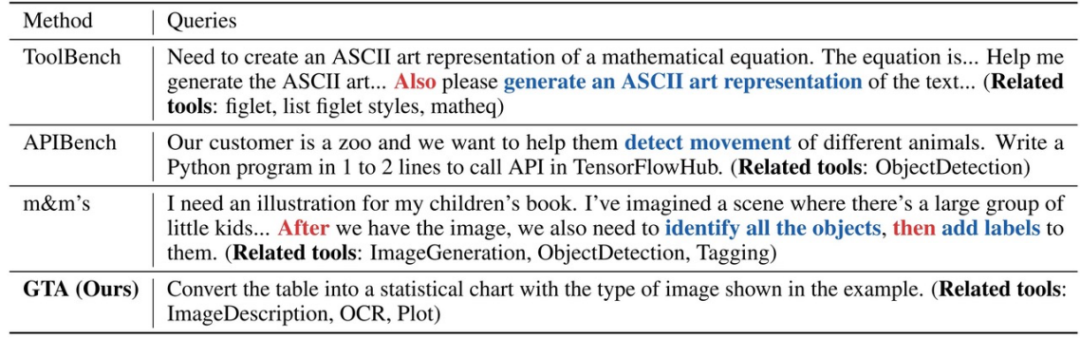 GTA 中的用户问题与现有工具评测的用户问题对比如下表所示。ToolBench 和 m&m's 中的问题明显地包含了需要调用的工具(蓝色字)以及步骤(红色字)。APIBench 中的问题较为简单,仅包含单个步骤。相较而言,GTA 的问题既是步骤隐含的,也是工具隐含的,并且是基于现实世界场景的、对人类有帮助的任务。
