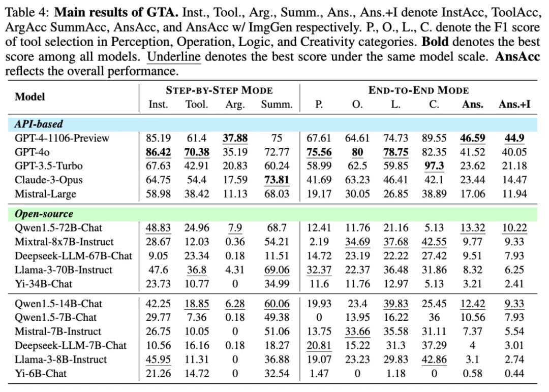 GTA 的评估结果表明,GPT-4 在面对真实世界问题时仅完成不到 50% 的任务,而大多数模型完成率低于 25%。揭示了现有模型在处理真实世界问题时面临的工具使用瓶颈,为未来的通用工具智能体提供了改进方向。