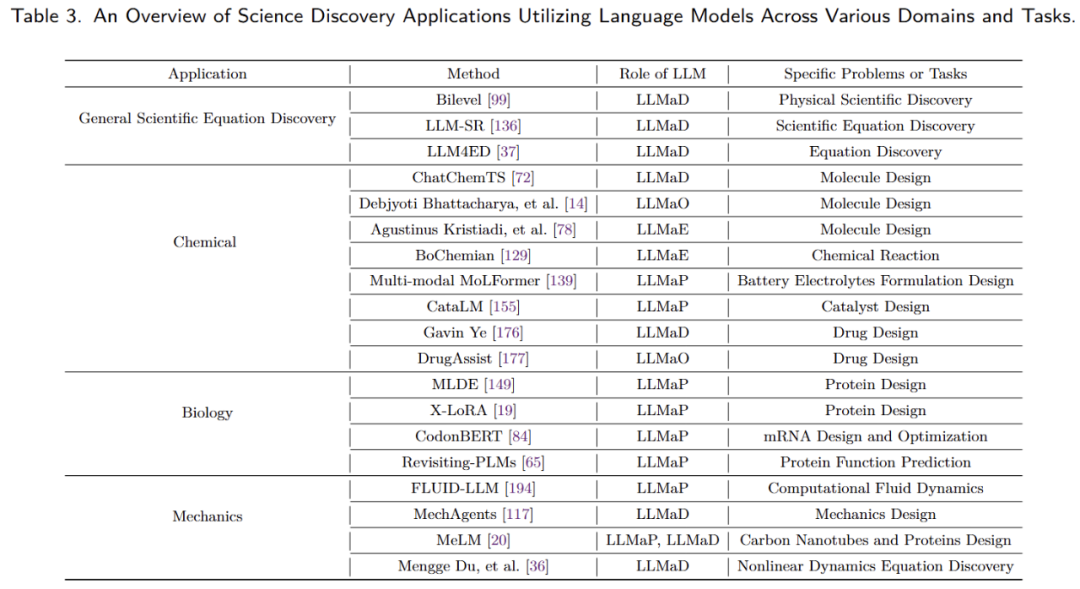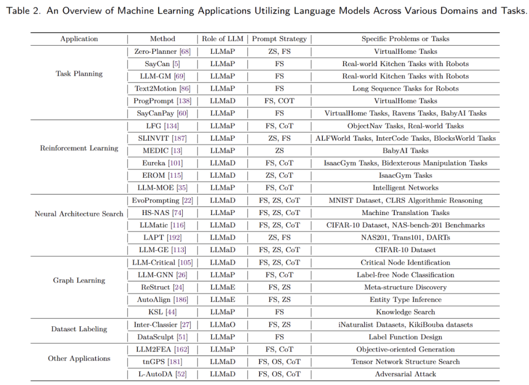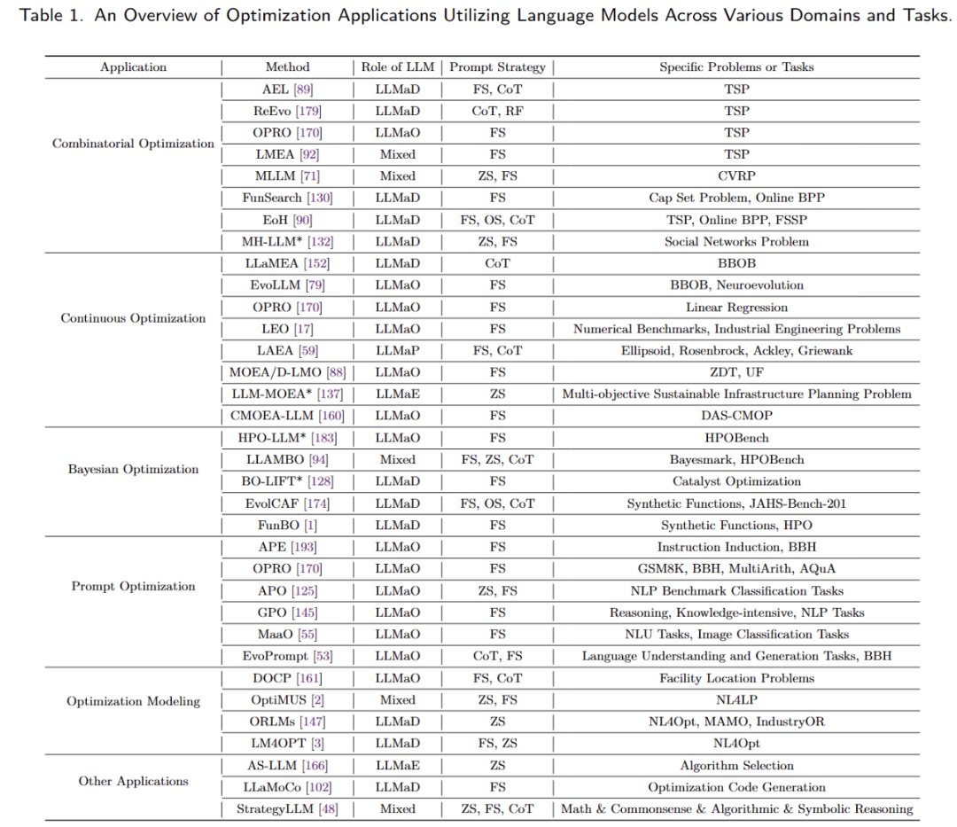 我们整理了四个主要的应用领域:1)优化,2)机器学习,3)科学发现,4)工业。其主要工作按照应用类别、方法、大模型结合范式、提示词策略和具体应用问题进行了分类罗列。具体介绍可以在全文中查看。