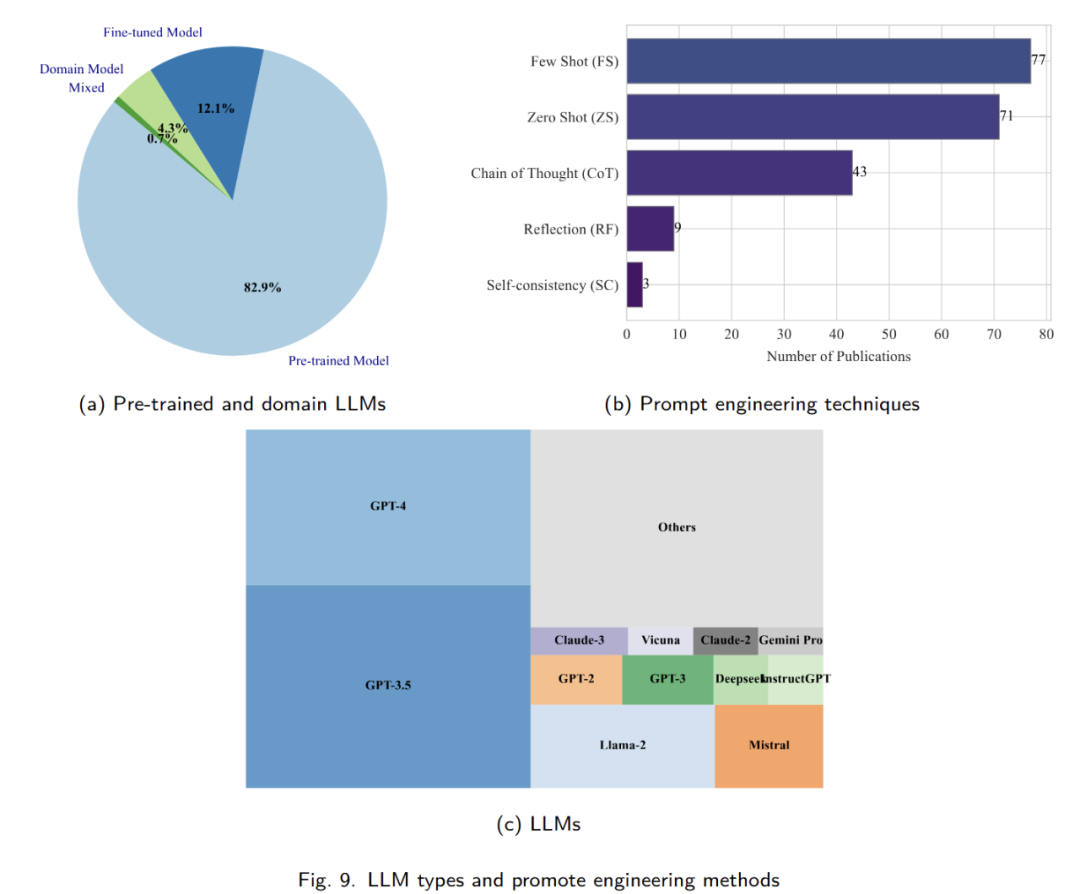 图中展示了文献中使用的领域或预训练语言模型(LLMs)的百分比。其中,超过 80%的研究选择使用未经特定微调的预训练模型,大约 10%的研究在领域数据集上对预训练模型进行了微调,其中只有 4.4%的模型是在特定问题上从头开始训练的。图中还展示了最常使用的 LLMs。在 LLM4AD 的论文中,GPT-4 和 GPT-3.5 是使用最多的 LLMs,总共占了大约 50%。Llama-2 是最常用的开源 LLM。一旦我们拥有了预训练的 LLMs,提示工程对于有效整合 LLMs 到算法设计中非常重要。我们讨论了 LLM4AD 论文中使用的主要提示工程方法的应用情况,包括零样本、少样本、思维链、一致性和反思。