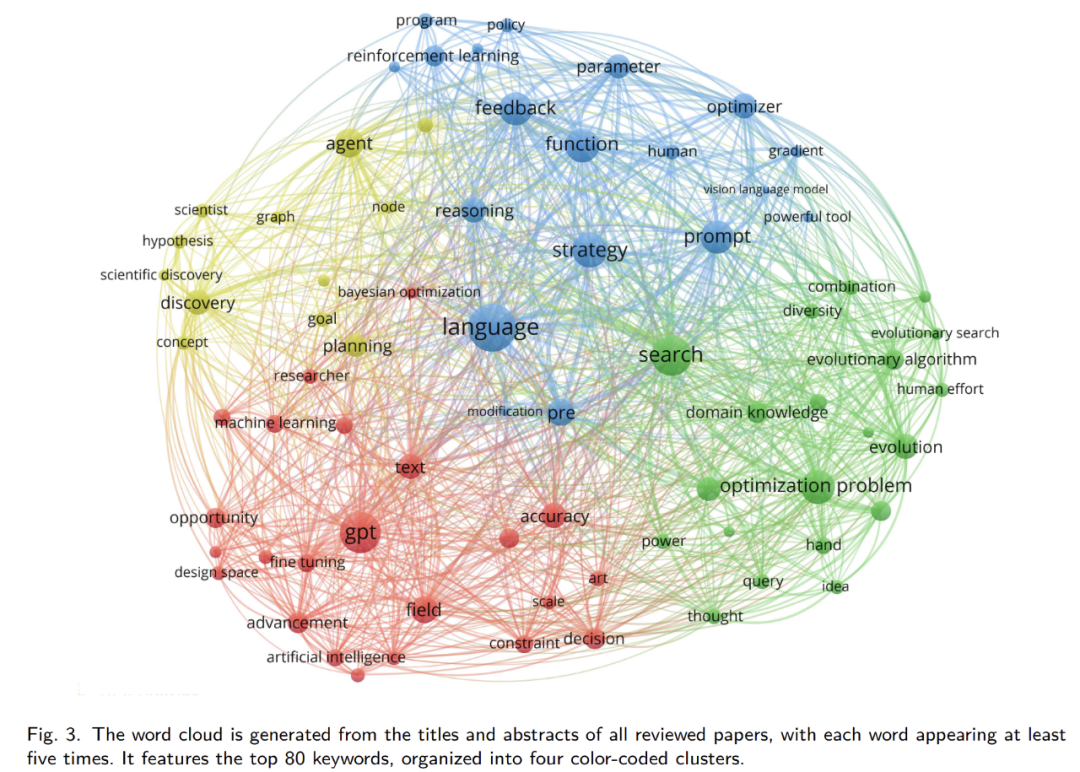 我们从所有审查过的论文的标题和摘要中生成了词云,每个词至少出现五次。它展示了前 80 个关键词,这些词被组织成四个颜色编码的簇,分别是 “语言”、“GPT”、“搜索和优化” 以及 “科学发现”。还突出显示了几个关键词,如 “进化”、“策略”、“优化器” 和 “代理”。