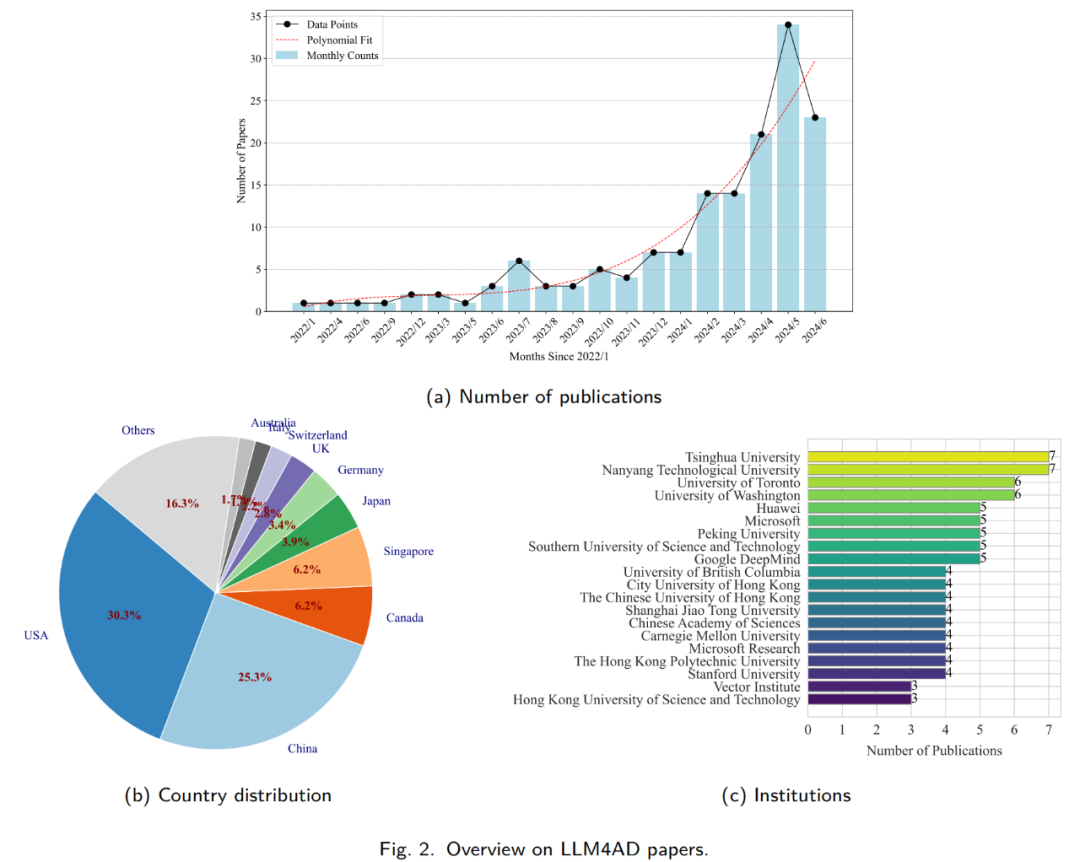 图中还显示了在 LLM4AD 出版物中领先的机构及其所在国家。美国领先,紧随其后的是中国,这两个国家单独占据了 50%的出版物。接下来的八个国家,包括新加坡、加拿大和日本,共同贡献了总出版物的三分之一。发表最多论文的研究机构包括清华大学、南洋理工大学和多伦多大学等知名大学,以及华为、微软和谷歌等大型公司。这种分布强调了研究主题的广泛兴趣和它们在现实世界中的实际应用的重大相关性。