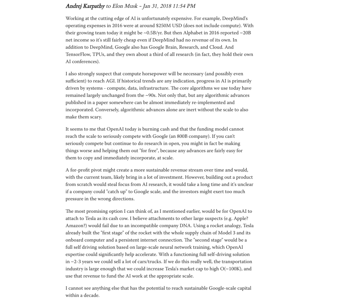 而 Karpathy 给出了他理想的解决方案。在他单独发给马斯克的邮件中,Karpathy 认为最有希望的选择是 OpenAI 把特斯拉作为摇钱树。他相信,与其他大型科技巨头(例如苹果、亚马逊)的合作会因为公司 DNA 不兼容而失败。