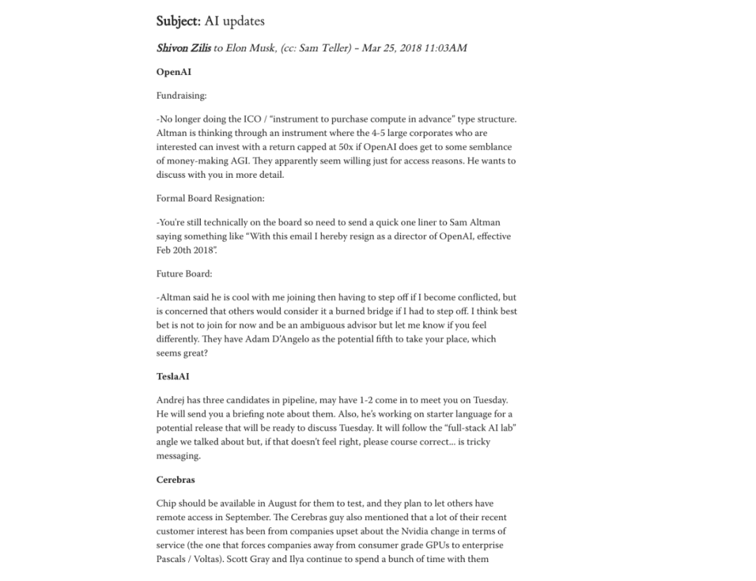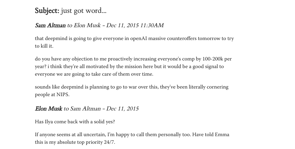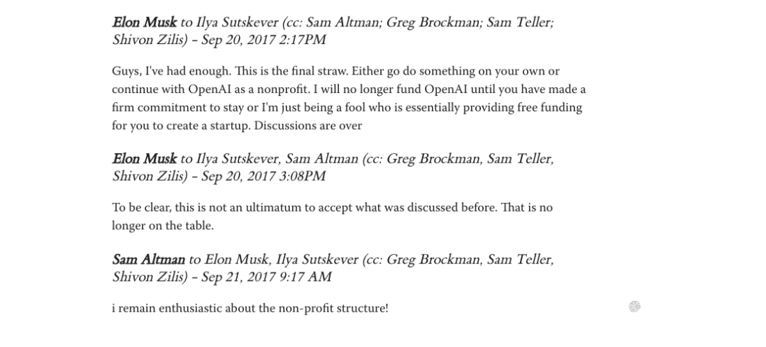 随着起诉文件的更新, Elon Musk、Sam Altman、Ilya Sutskever 和 Greg Brockman 之间的往来邮件已经作为法庭诉讼程序的一部分公开。