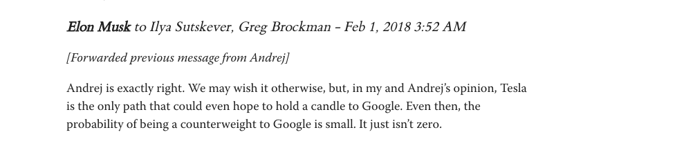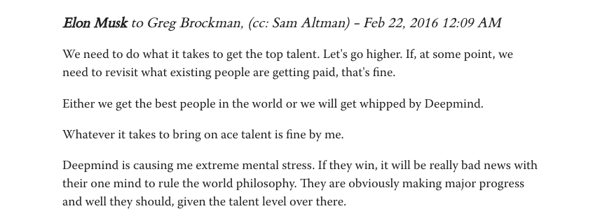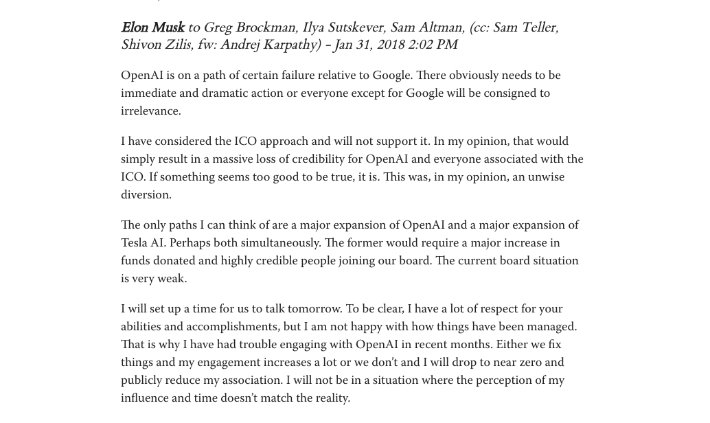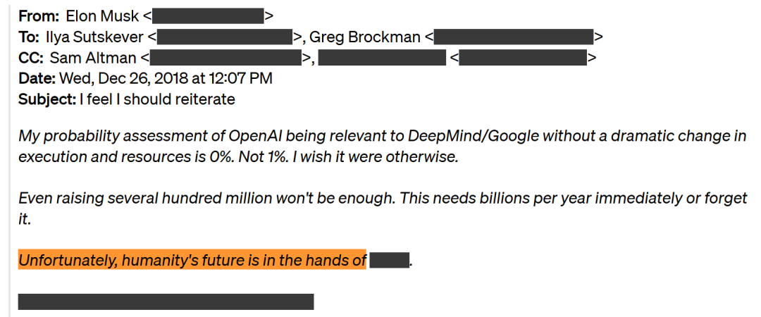 在第一批曝光的邮件中,引起最大讨论的要数马斯克发给 Ilya 和 Greg 的这封邮件: