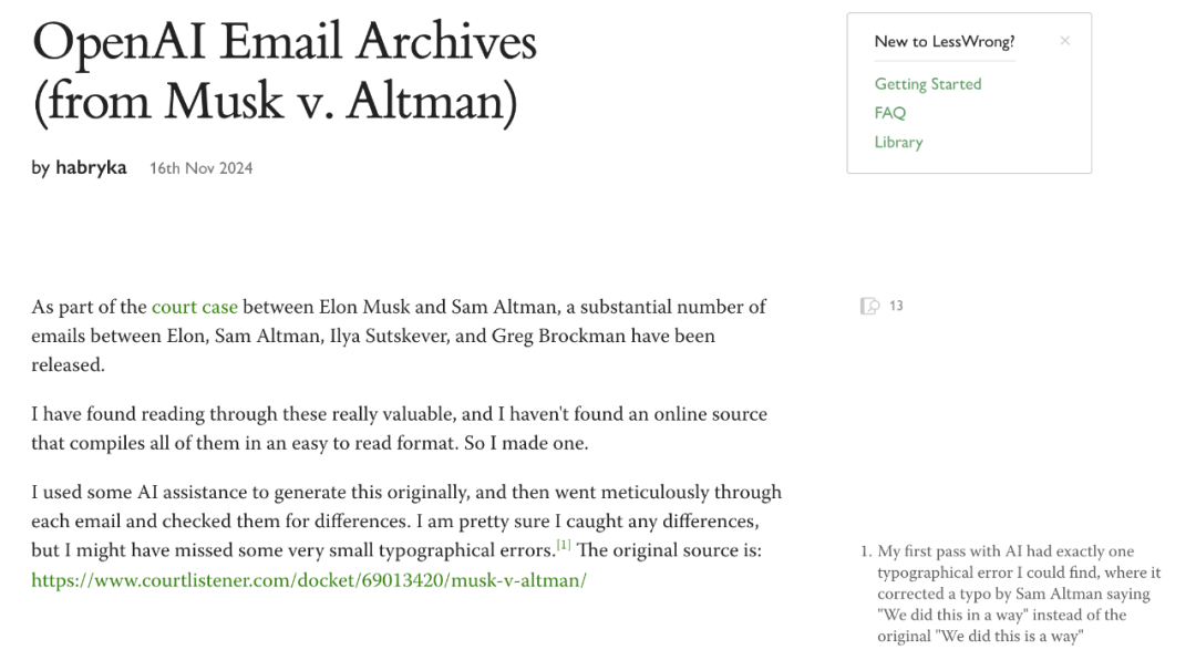 链接:https://www.lesswrong.com/posts/5jjk4CDnj9tA7ugxr/openai-email-archives-from-musk-v-altman