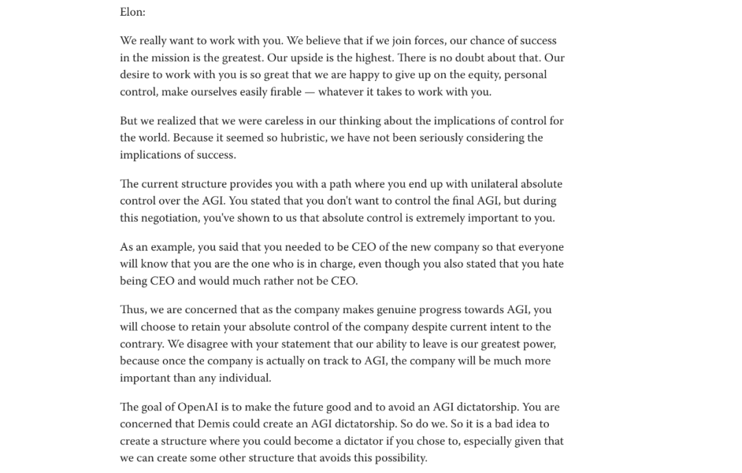 OpenAI 的目标是创造一个美好的未来,并避免 AGI 独裁。您担心哈萨比斯(Demis Hassabis,谷歌 DeepMind CEO)可能会建立一个 AGI 独裁政权,这一点我们也同样忧虑。 因此,构建一个可能让您成为独裁者的公司结构,无疑是糟糕的选择,尤其在完全可以设计出能够避免此风险的另一种结构的情况下。
