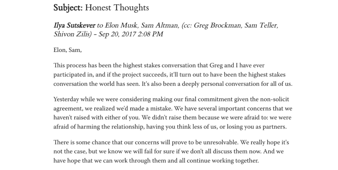 于是 Ilya Sutskever 在这封主题为「Honest Thoughts」的邮件中进一步提出了对马斯克担任公司领导者的顾虑: