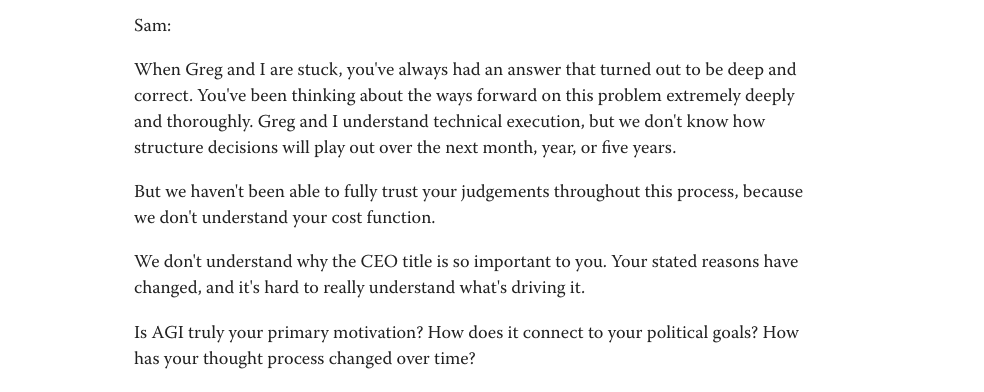 在整个过程中,我们始终无法完全信任您的判断,因为我们无法理解您的动机。 我们不明白为什么 CEO 这个头衔对您如此重要。您给出的理由一再改变,让人难以真正理解背后的动机。 AGI 真的是您的主要动力吗?它与您的政治目标有何关联?