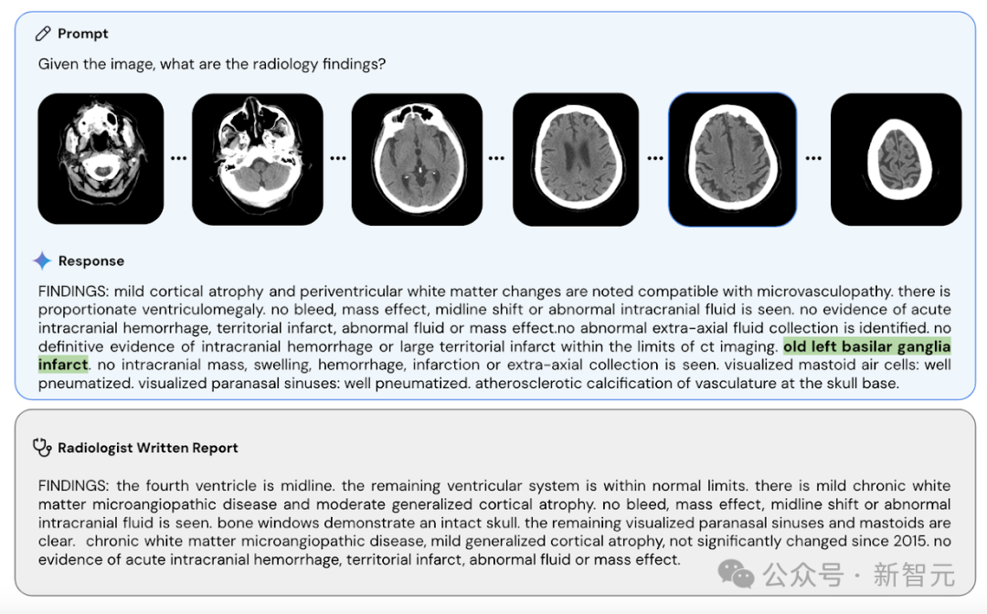 Med-Gemini-3D能够为CT扫描生成报告,这比标准X光成像复杂得多。在此示例中,Med-Gemini-3D的报告正确地包含了原始放射科医生报告中遗漏的一处病变(用绿色标出)