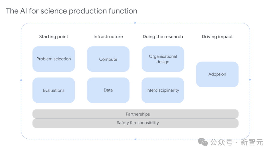 从科学研究的问题选择(Problem selection)、模型评估(Evaluations)开始,通过计算资源(Compute)和数据(Data)这些基础设施的支持,在开展研究过程中注重组织模式设计(Organizational design)和跨学科(Interdisciplinarity),形成成果,并最终通过采纳(Adoption)将研究成果转化为实际影响。底部的合作(Partnerships)、安全与责任(Safety & responsibility)贯穿始终,确保整个流程高效且符合道德规范。