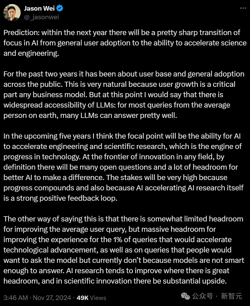 OpenAI科学家Jason Wei最近发帖预测:在接下来的一年内,AI的关注重点可能会从日常使用转向科学领域。