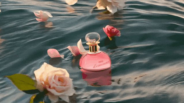 空中俯瞰,镜头缓缓推进,一只香水瓶在海浪中轻盈起伏,四周簇拥着盛放的花朵,画面氛围如梦似幻,朦胧而浪漫。