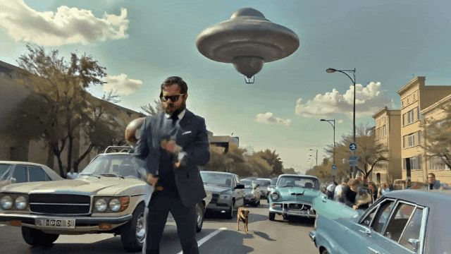 得益于Pika 2.0无与伦比的文本对齐能力,杂糅了如此多的的角色和物品之后,场景里的每个元素依然能保持原有的样子。