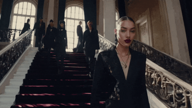 在极简的灰调空间内,点缀着几个圆球装置,一位身着华贵皮草的黑人模特优雅地向镜头喷洒香水,随即转身款款离去