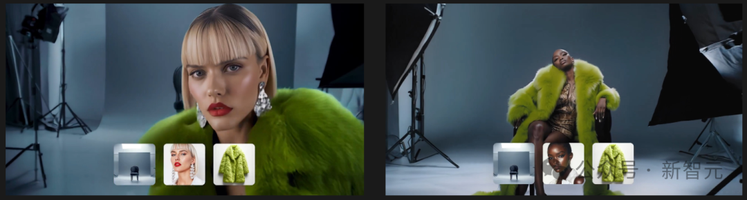 比如,把白人模特换成黑人之后,背景的影棚和身上的绿色皮草并没有发生改变。