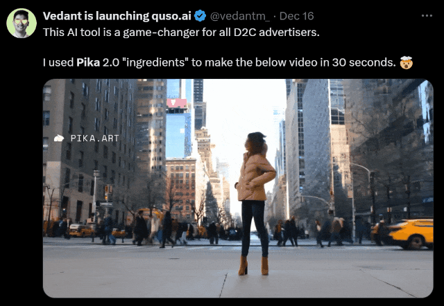 这位网友,用Pika 2.0在30秒内做出了属于自己的广告大片,直言「游戏规则被改变!」