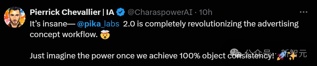 被惊艳的网友感慨道:Pika 2.0彻底改变了广告圈的工作流!试想一下,一旦实现了100%的对象一致性,威力将会多么巨大。