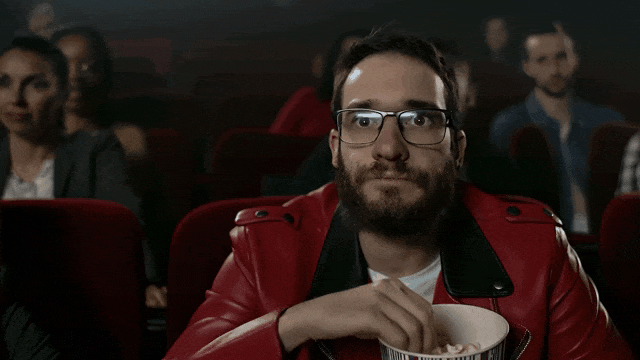 昏暗的影院中,一对身着黑色皮夹克的观众正共享着一桶爆米花,他们目不转睛地注视着银幕,眼神中流露出全神贯注的专注