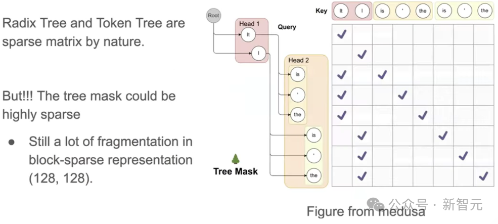 再看Speculative Decoding,多个草稿小模型生成的token序列通常组织成token tree的形式,表示成矩阵时是稀疏的。