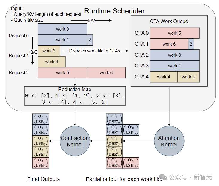 FlashInfer实现了高效的注意力合成算子,可以处理变长聚合。每个CTA的工作队列,以及部分输出与最终输出之间的映射,都由调度程序规划。